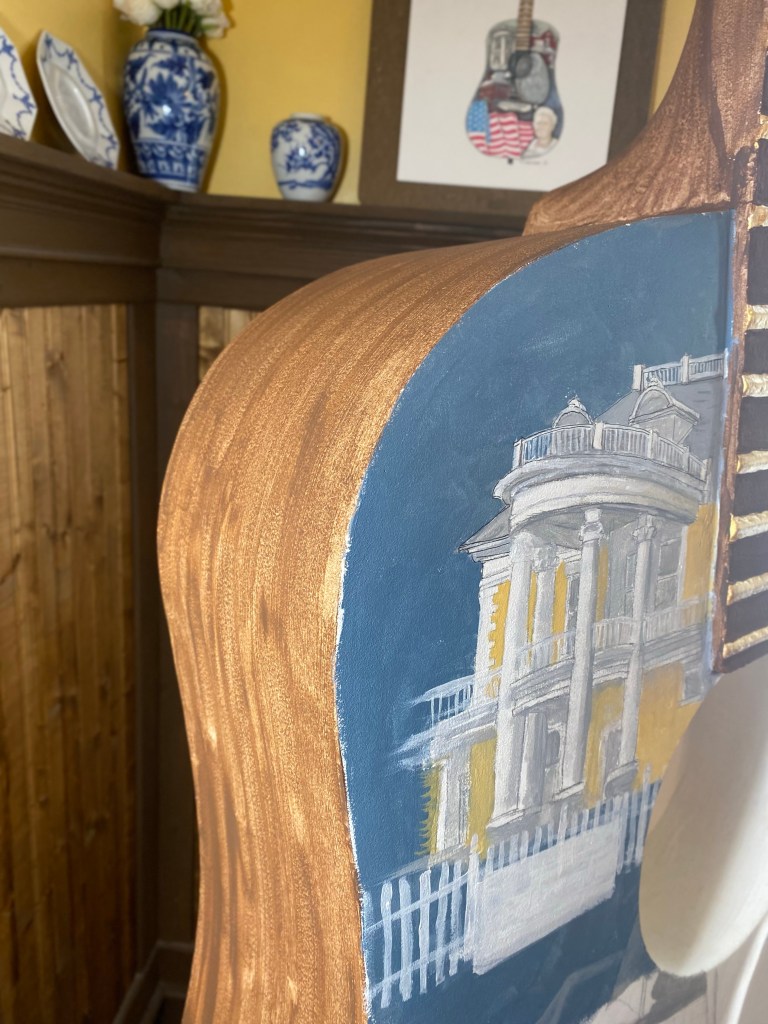 Today I am spotlighting a pic showing the first of my work on this guitar. I am pleased with how the faux wood grain turned out. The J.C. Welch home is one of the grand homes in Kendall Place Historic District. Still much to do before this house is complete…